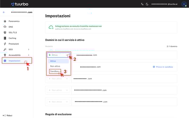 - Cambia lo stato del dominio da Attivo a Sandbox.