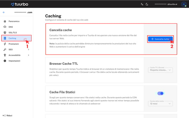 - Clicca su "Cancella tutto" per eliminare la cache del sito.